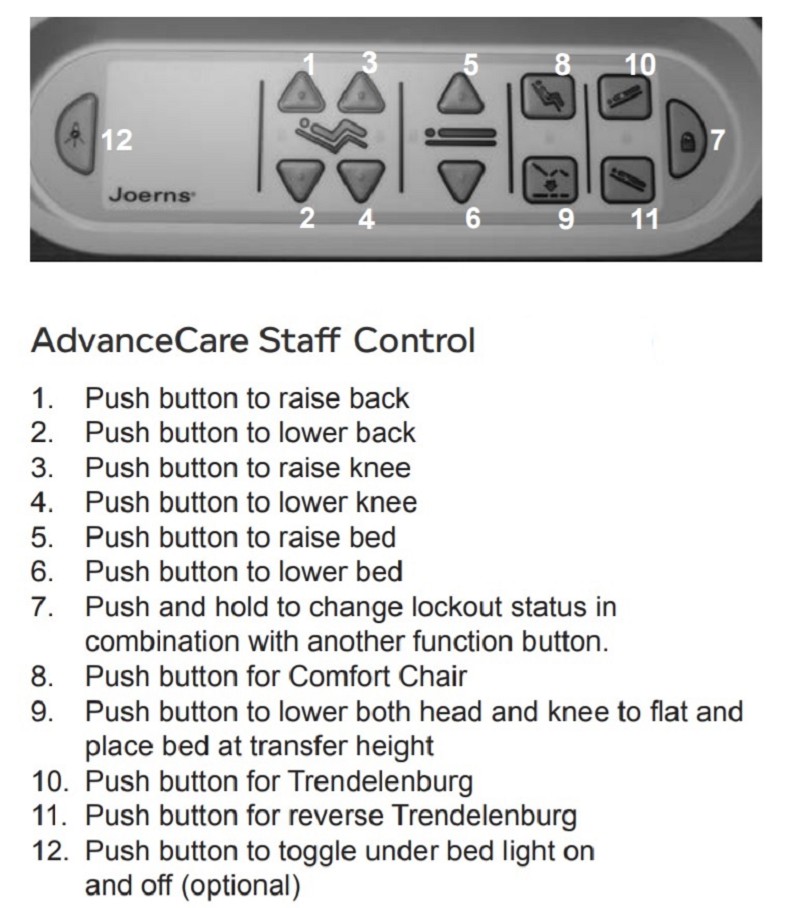 How to unlock joerns bed hand control. Make sure the bed is in a locked position with respect to the floor by ensuring the casters are off the floor or if equipped the care lock is in the locked position before attempting any resident transfers. Joerns assist device until you verify it is locked in place. Learn more rc ultra hi lo 850.